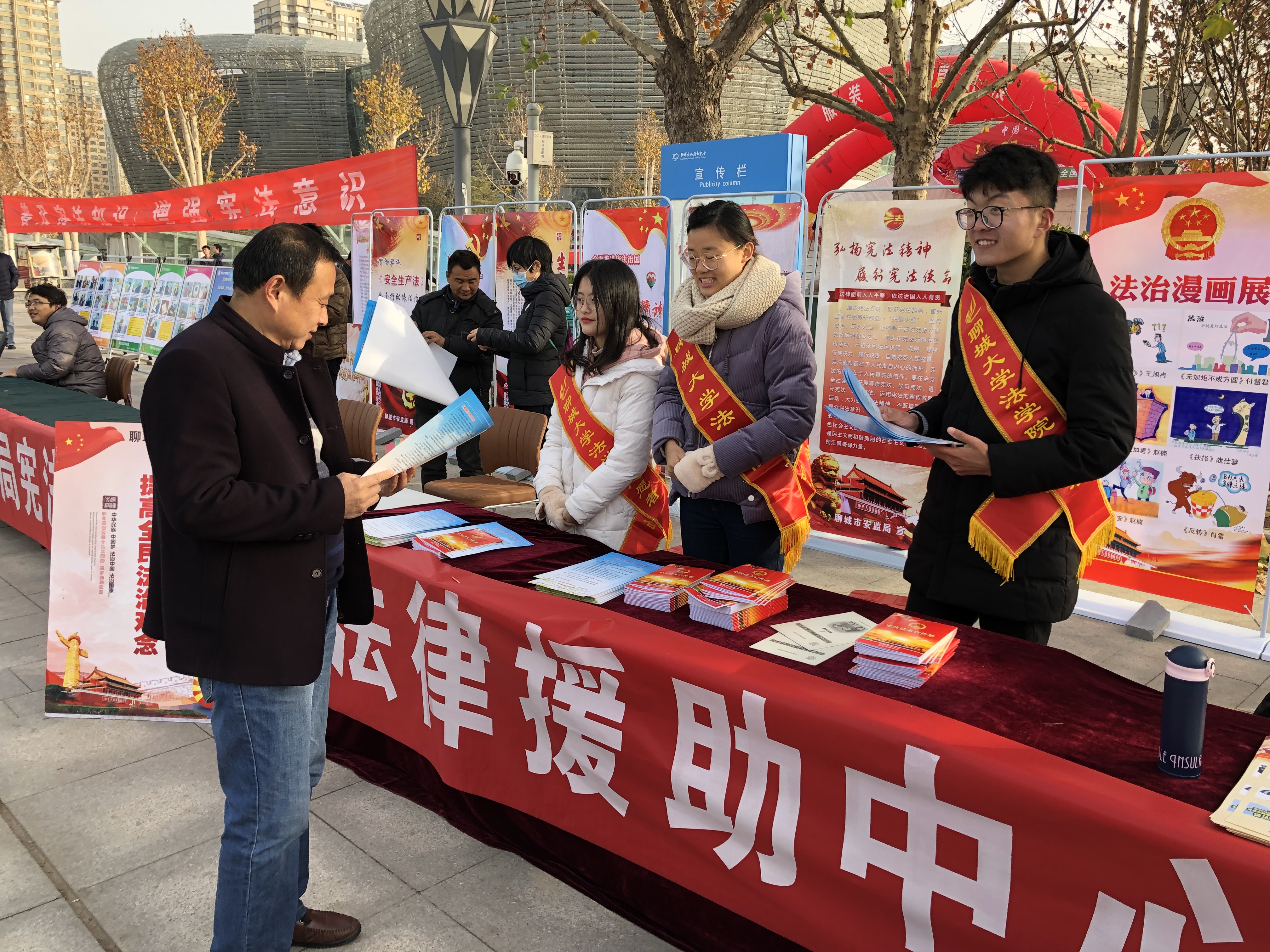 随着依法治国方略的落实,市民的学法、尊法、用法意识不断增强,为弘扬宪法作为根本大法的权威精神,助力依法治国方略的实施, 12月4日,tyc41183太阳成集团联合聊城市法律援助中心来到聊城市市民广场举行“与宪通行,扬法之威”普法宣传活动,聊城市市委常委王彤宇、聊城市法律援助中心主任孟宪东到场视察。