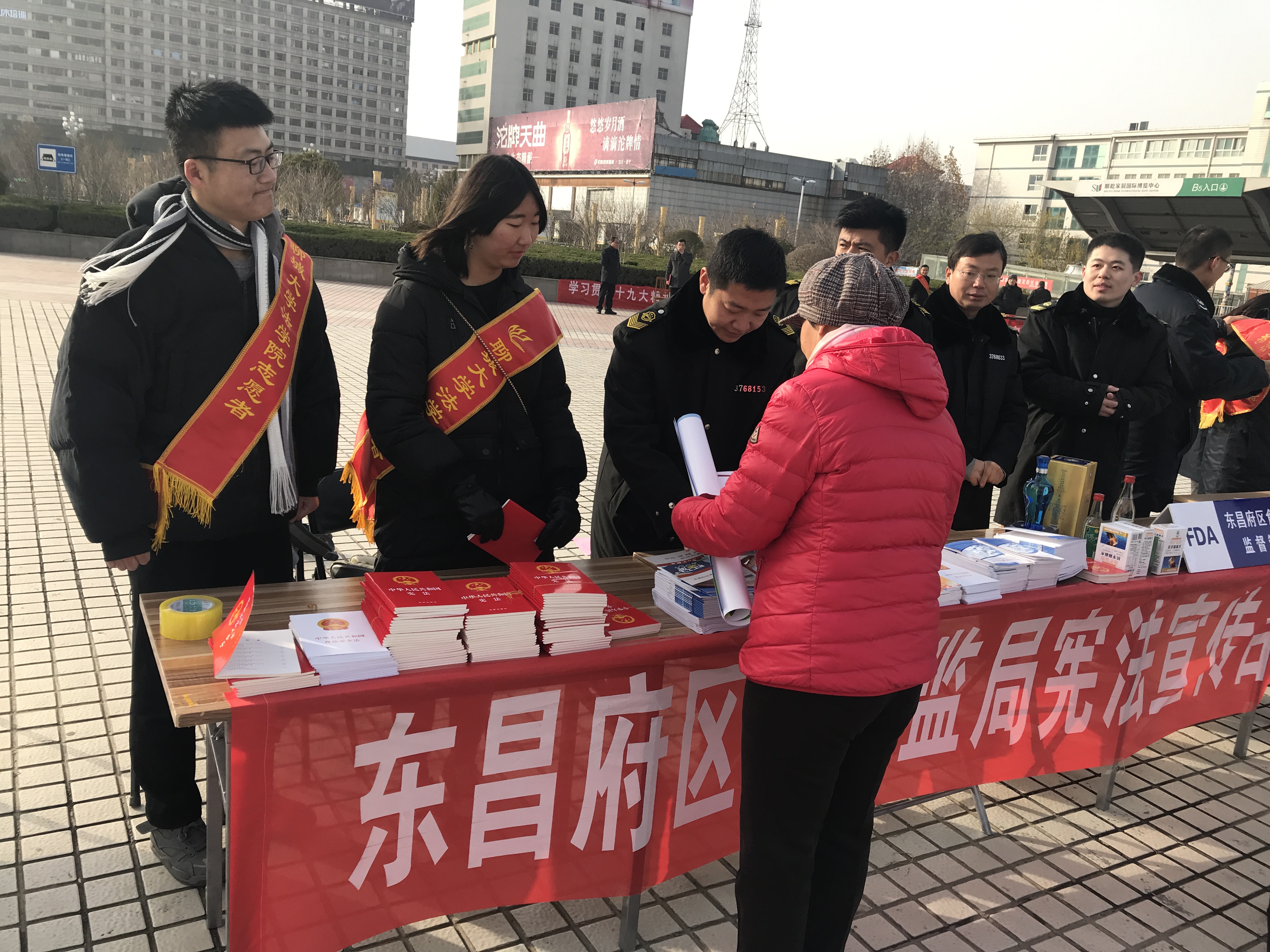 为深化法科学子宪法教育,大力弘扬宪法精神,加快推进全面依法守法进程,扎实开展“七五普法”,12月4日,tyc41183太阳成集团志愿者联合东昌府区食品药品监督管理局于聊城市人民广场举办以"弘扬宪法精神,建设法制中国"为主题的宪法日系列活动。