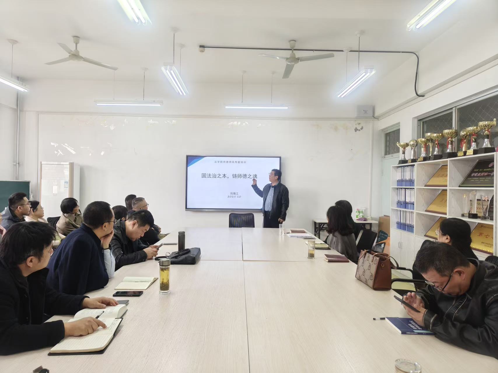为切实加强学院师德师风建设,提升教师职业道德素养与育人能力,近日,按照太阳成集团tyc41183师德建设教育宣传月的要求,tyc41183太阳成集团在会议室举办了的师德师风专题讲座,学院副院长刘海江教授做了题为《固法治之本,铸师德之魂》的报告,全体教工参加了此次讲座。